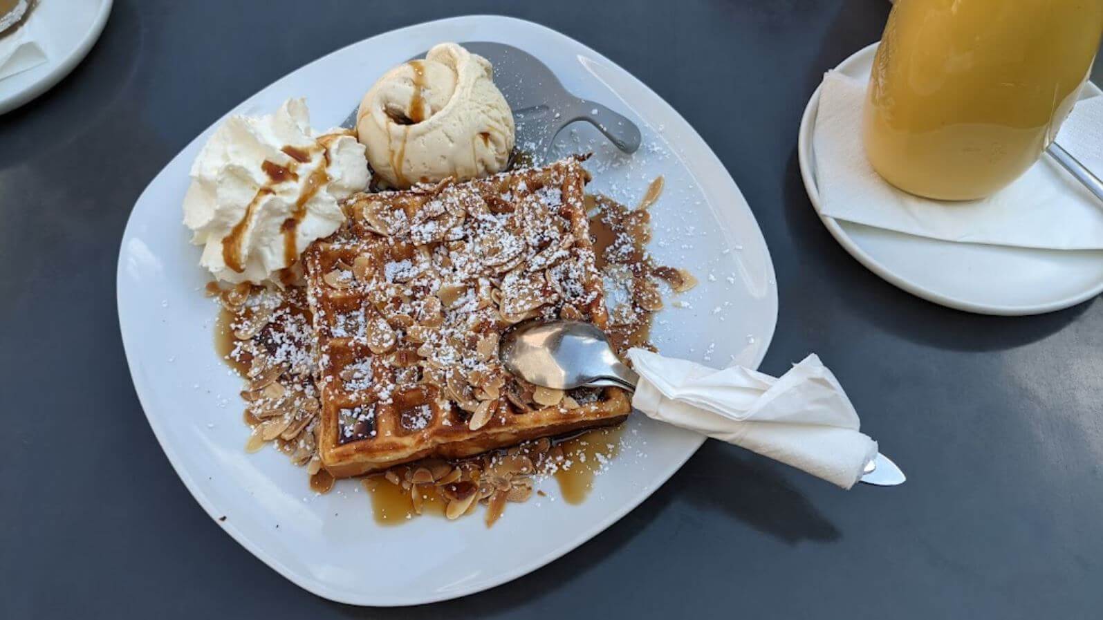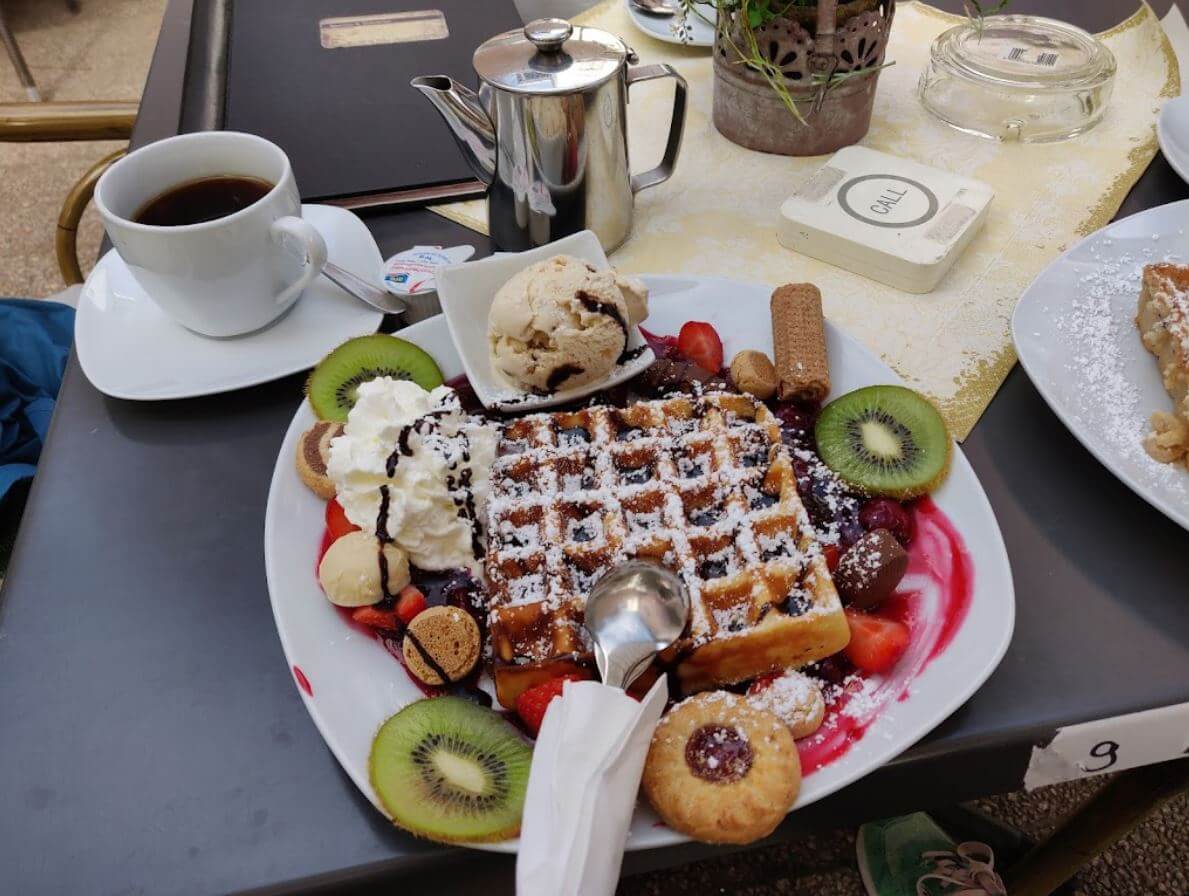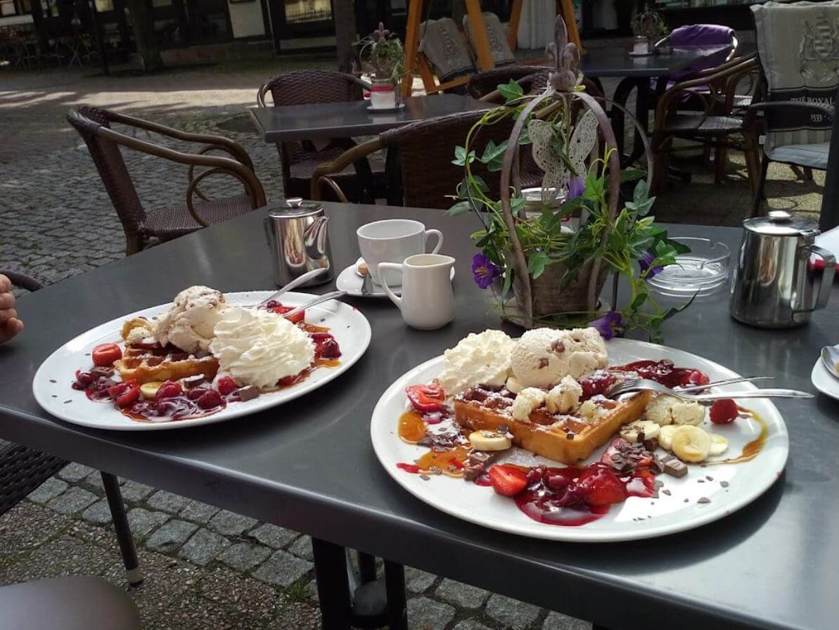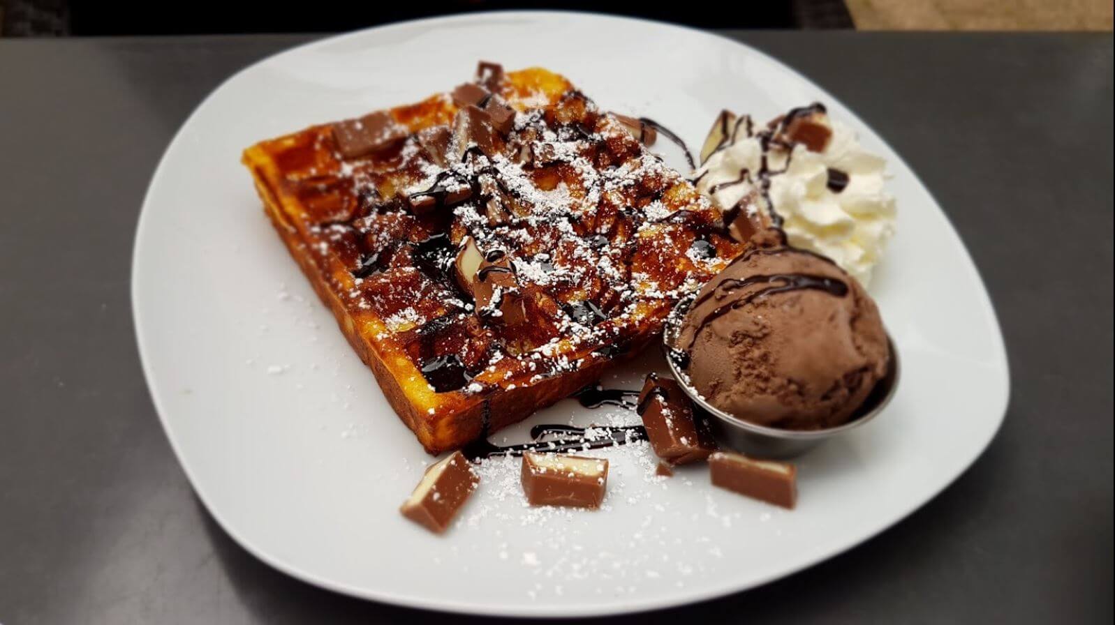 Da Waffeln und warme Speisen an zwei unterschiedlichen Posten zubereitet werden können diese nicht immer zu gleichen Zeiten serviert werden.